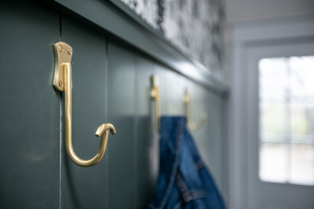 The rear entryway gave us a chance to take a risk. We paneled the walls in vertical planks, painted a deep green to echo the cabinetry found throughout the home. On top, we layered in graphic wallpaper in black and white. The pattern is playful but not precious. This space had to be functional, but we wanted it to feel like part of the design story too.